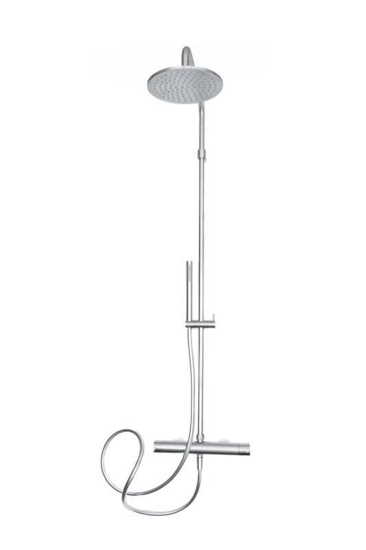 Η συνδυασμός ντους είναι κατασκευασμένος από υψηλής ποιότητας ορείχαλκο και φινιρισμένος με ανθεκτική επιχρωμιωμένη επίστρωση. Αυτό εξασφαλίζει πολυτελή εμφάνιση, εξαιρετική αντοχή στη φθορά και μακροχρόνια αξιοπιστία. Χάρη στον θερμοστατικό αναμικτήρα, η θερμοκρασία του νερού παραμένει σταθερή, ακόμη και σε περίπτωση μεταβολής της πίεσης του νερού.
